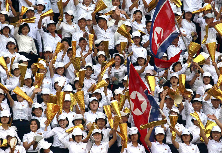 북한 팬들이 월드컵 2022 예선전에서 레바논을 이긴 뒤 승리를 자축하고 있다.
